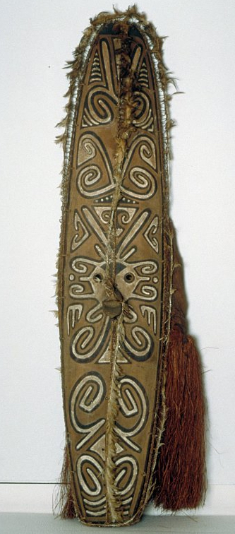 Description Keveke refers to the fact that plant fibre and feathers surround this mask. Ancestor boards such as these are also known as kwoi, because they function as portraits of a guardian’s spirit. Their anthropometric form is both celebratory and intimidating. It is possible that the shield derives from the Wapo Creek area, in the central Gulf of Papua. (Te Moananui a Kiwa)