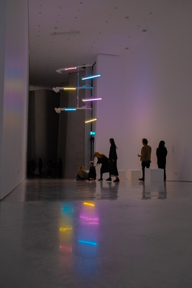 Chartwell Notes "Spectra V is a suspended kinetic sculpture that imbues the gallery walls with shifting chromatic washes of colour. Both affecting and sensorial, it produces an immersive experience for audiences on a somatic level, playing with ocular perception. As an assemblage of fluorescent lights, power boards, and domestic fans repurposed from e-rubbish and consumer detritus, its truth to materials echoes modernist expanded cinema, where technological apparatus is made visible.